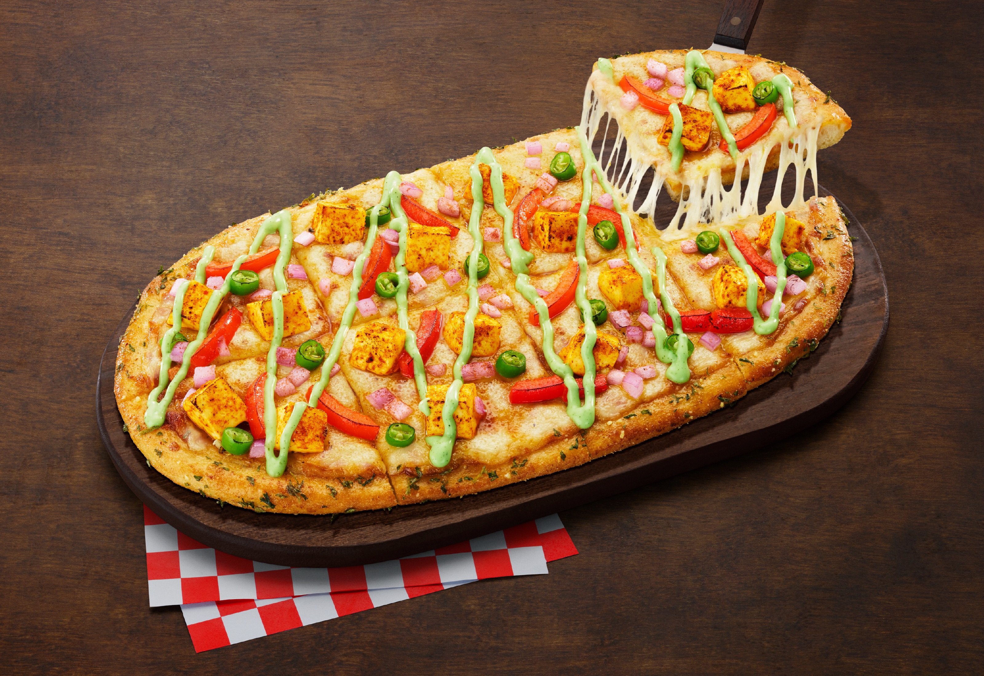 Mozzarella Cheese, Masala Paneer, Onions, Green Chilli, Red Bell Pepper, Makhni Sauce, Mint Sauce Drizzle